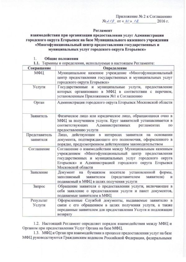 Соглашение №219 о взаимодействии между Муниципальным казенным учреждением «Многофункциональный центр по предоставлению государственных и муниципальных услуг городского округа Егорьевск» и Администрацией городского округа Егорьевск Московской области от 30.12.2016